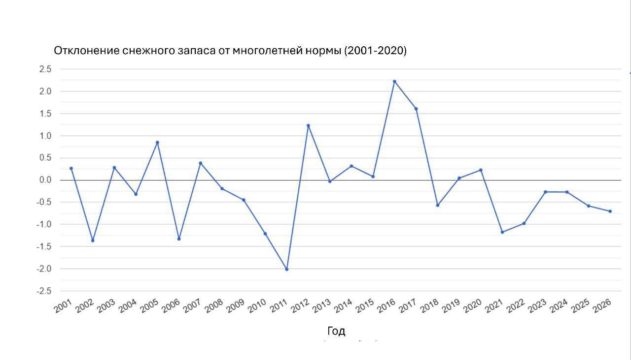 Наблюдения фиксируют, что снегозапасы остаются отрицательными уже третий год подряд. Осадки в начале зимы также были ниже среднего многолетнего уровня. Совокупность этих факторов неизбежно приведет к рекордному минимуму доступной для орошения воды в летний период 2026 года.