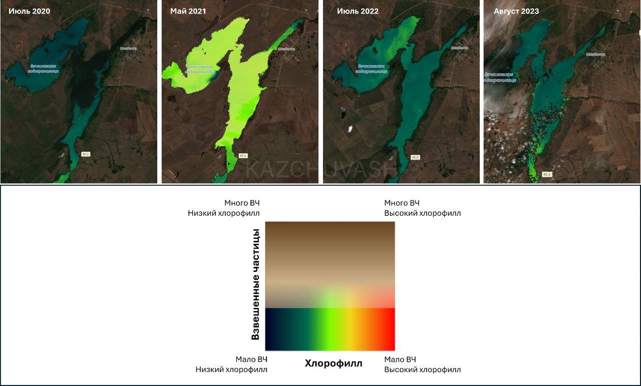 На спутниковых снимках ярко-зеленым подкрашены взвешенные частицы и хлорофилл. Очень активные в месте, где небольшая речушка впадает в водохранилище (справа). А вдоль этой речки, и других мелких впадающих в неё, вверх по течению - огромные распаханные поля. Кое-где на расстоянии около 25 метров от реки. Надо понимать, что талые и дождевые воды смывают с полей всю химию, которой обрабатывали и прямиком доставляет в водохранилище. А в прошлом году паводки сделали это в несколько раз сильнее.